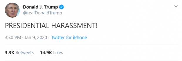 ABD Başkanı Donald Trump sosyal medya hesabından paylaştığı mesajla gündem oldu. "Presidential Harassment!" yazdığı tweetinde, Başkan Trump'ın azil süreci ile ilgili üstüne gelindiğini ima ettiği yorumu yapıldı.