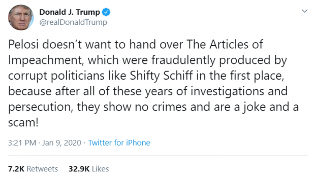 Donald Trump Temsilciler Meclisi'nin Demokrat sözcüsü Nancy Pelosi ve diğer senatörler hakkında çok sert açıklamalarda bulundu. Azil belgelerinin yozlaşmış siyasetçiler tarafından hazırlandığını öne süren Trump, süreç kapsamında yapılan soruşturmaların hiçbir suça işaret etmediğini belirtti. Trump, azil sürecini başlatan senatörleri şaka gibi ve düzenbaz olarak niteledi.