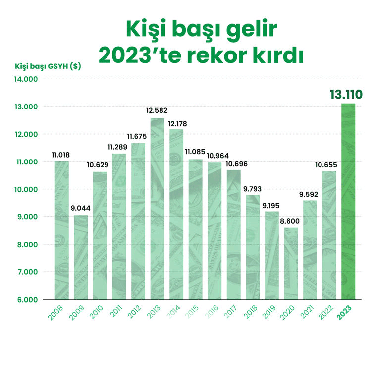 2023'te kişi başı gelir 13.110 dolarla yeni zirvesine ulaştı. Böylece 2013'te görülen 12 bin 582 dolarlık zirve 10 yılın ardından aşılmış oldu
