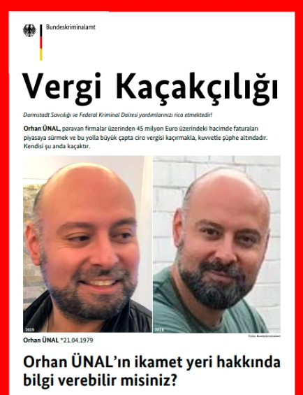Alman Federal Kriminal Polisi, paravan firmalar üzerinden 45 milyon Euro üzerindeki hacimde faturaları piyasaya sürmek ve bu yolla büyük çapta vergi kaçırmak iddiasıyla aradığı Orhan Ünal adlı şahıs için Almanya'daki gurbetçi Türklerden yardım istedi.