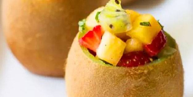 Kivilerin içini boşaltıp, çıkan kivileri minik minik doğrayın. Çilek ve ananasları yine küçük küçük doğrayıp kivilerin içine ekleyin. Yarım limonu sıkıp bu karışıma ilave edin. Tüm malzemeleri karıştırıp, kivilerin içini doldurun.