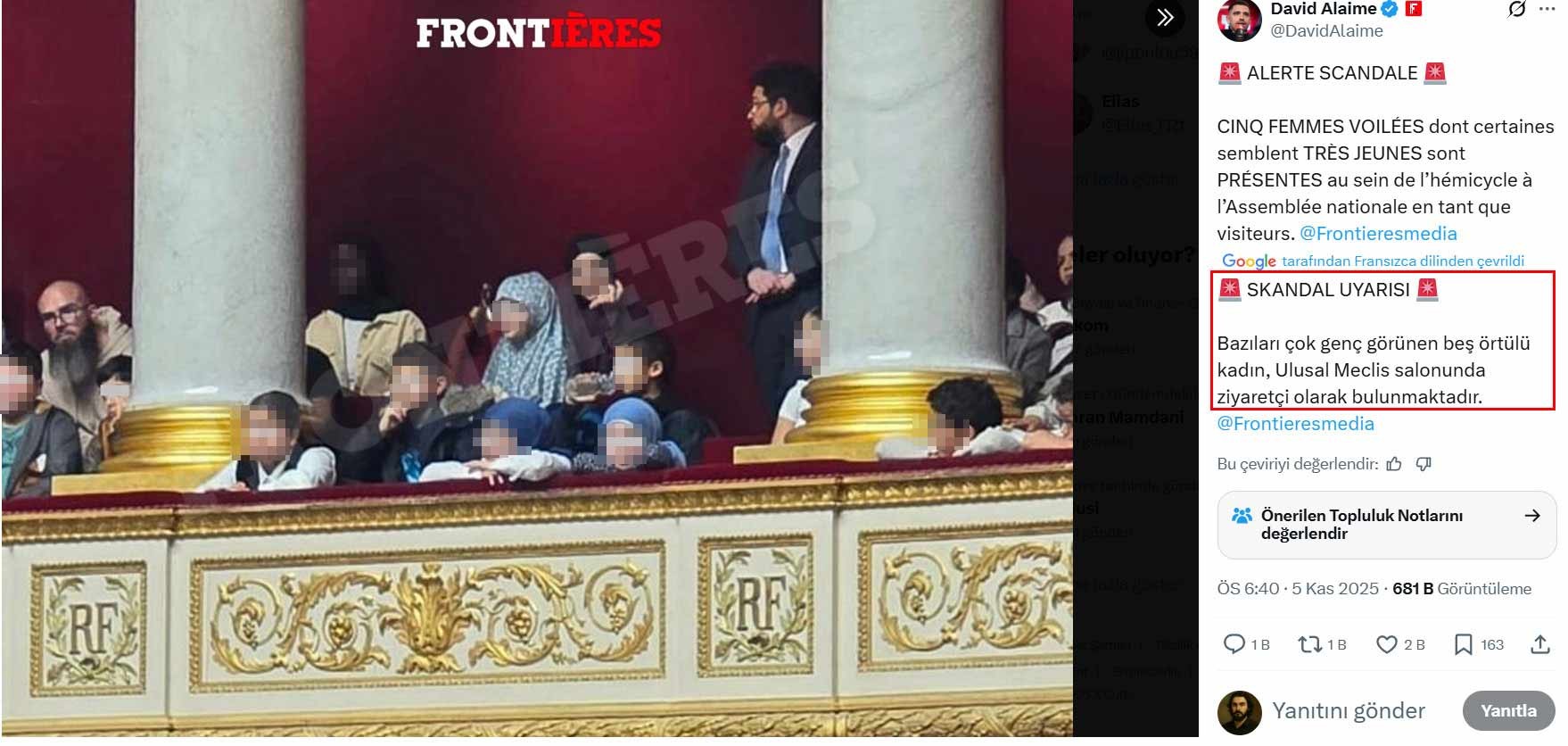 Fransa'da Frontieres Media sitesinin Yayın Yönetmeni David Alaime, dün, ABD merkezli X şirketinin sosyal medya platformundan yaptığı açıklamada, "Skandal Uyarısı! Meclis Genel Kurulunda, aralarında bazıları oldukça genç görünenlerin de olduğu 5 başörtülü kadın ziyaretçi bulunuyor." ifadesini kullandı.