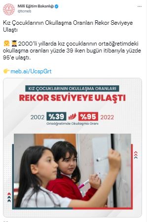 2000'li yıllarda kız çocuklarının ortaöğretimdeki okullaşma oranları yüzde 39 iken bugün itibarıyla yüzde 95'e ulaştı. Böylece ilk kez kız çocuklarının okullaşma oranı erkek çocukları geçti.