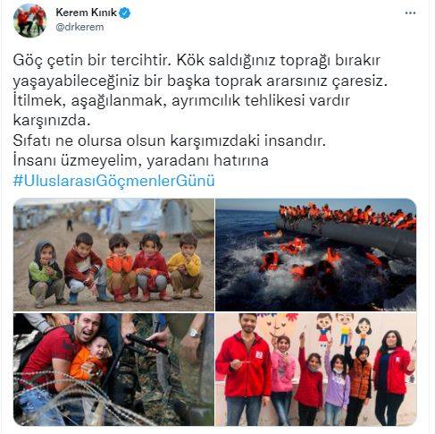 Türk Kızılay Genel Başkanı Dr. Kerem Kınık, 18 Aralık Uluslararası Göçmenler Günü dolayısıyla sosyal medya hesabından paylaşımda bulundu.