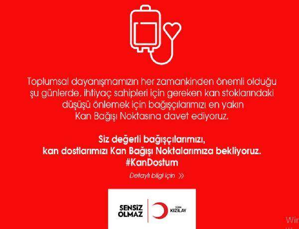 Türk Kızılay, kan stoklarının azaldığını açıklayarak, vatandaşlara kan bağışı yapma konusunda çağrı yaptı. Türk Kızılay, resmi internet sitesinden ‘’KanDostum, Biz kötü günleri hep beraber atlattık. Şimdi sana her zamankinden çok ihtiyacımız var. Kan stoklarımız azalırken bizi yalnız bırakma. Kan merkezlerimizi ziyaret et. ‘İyilikSensizOlmaz" paylaşımını yaptı.