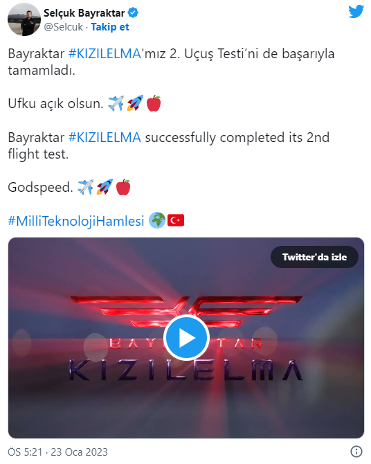 Baykar Genel Müdürü Selçuk Bayraktar sosyal medya platformu Twitter'dan yaptığı açıklamada "Bayraktar #KIZILELMA'mız 2. Uçuş Testi'ni de başarıyla tamamladı. Ufku açık olsun" dedi.
