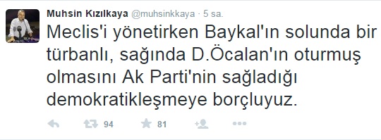 "Meclis'i yönetirken Baykal'ın solunda bir türbanlı, sağında D.Öcalan'ın oturmuş olmasını Ak Parti'nin sağladığı demokratikleşmeye borçluyuz."