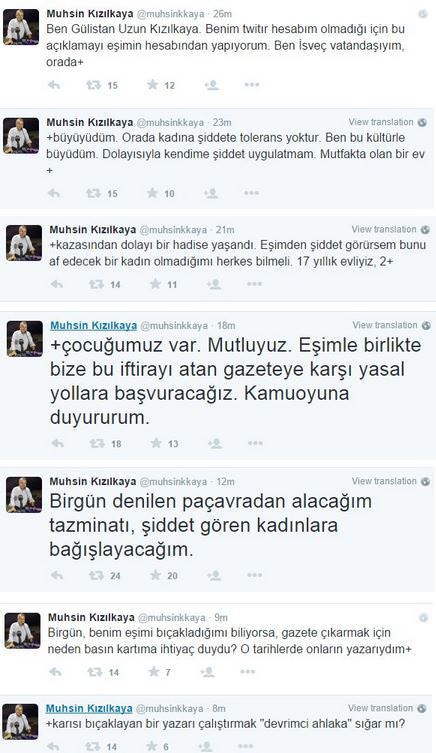 Eşi AK Parti Mersin Milletvekili Muhsin Kızılkaya tarafından bıçaklandığı iddia edilen Gülistan Kızılkaya, konu hakkındaki iddiaları yalanladı. Yaşananların kaza olduğunu söyleyen Gülten Kızılkaya, Birgün gazetesine iddialarla ilgili dava açacağını ve alacağı tazminatı şiddet gören kadınlara bağışlayacağını belirtti.