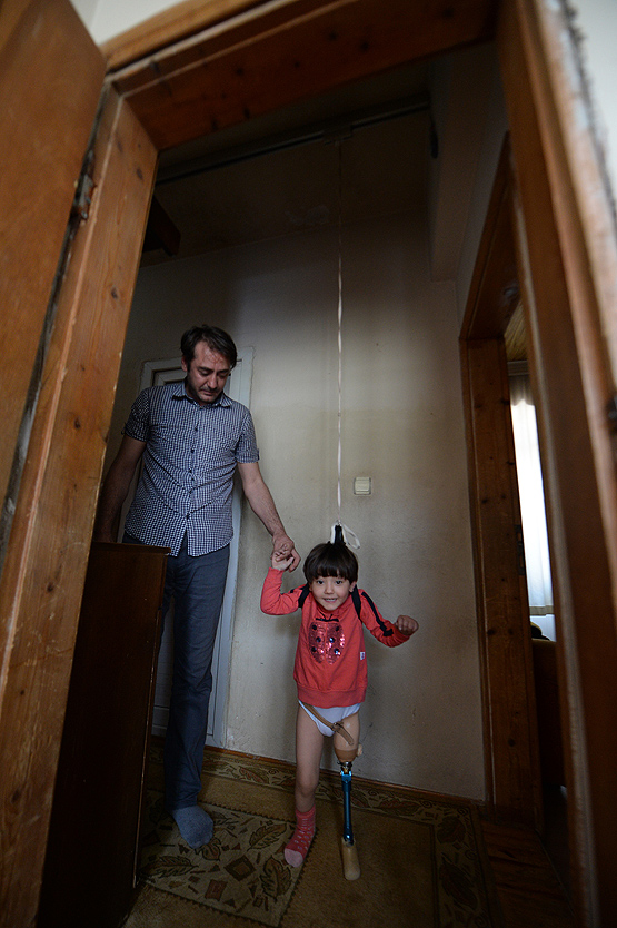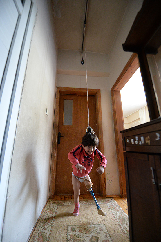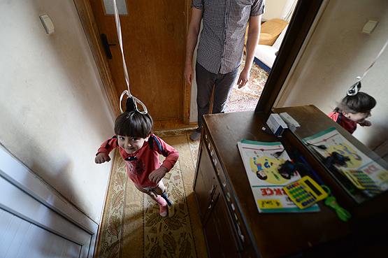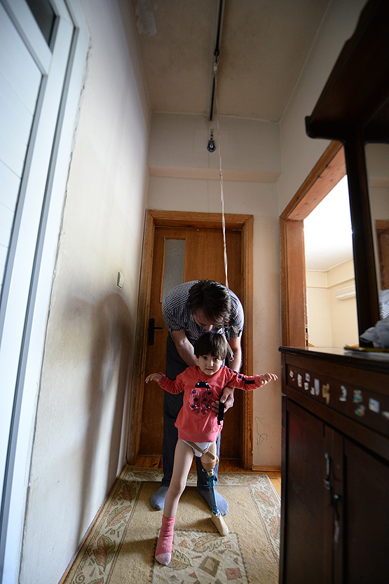 Antalyalı alüminyum doğrama ustası Ali İhsan Yıldırım, bir ayağını bebekken kaybeden 3,5 yaşındaki kızı Özge'nin protez ayak ile rahat yürüyebilmesi için evinin tavanına, tekerlekli alüminyum ve ipten oluşan düzenek kurdu.