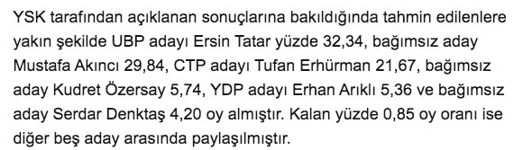 11 Ekim'de yapılan seçimin ilk turunu Tatar oyların yüzde 32,34'ünü alarak birinci, Akıncı ise yüzde 29,80'ini alarak ikinci sırada tamamlamıştı. KKTC’li seçmenler cumhurbaşkanlığı ikinci tur seçimi için sandık başında. KKTC Yüksek Seçim Kurulu, seçim yasağını 19:00’da kaldırmasıyla birlikte KKTC ikinci tur cumhurbaşkanlığı seçim sonuçlarına göre UBP adayı Ersin Tatar KKTC'nin yeni cumhurbaşkanı oldu.