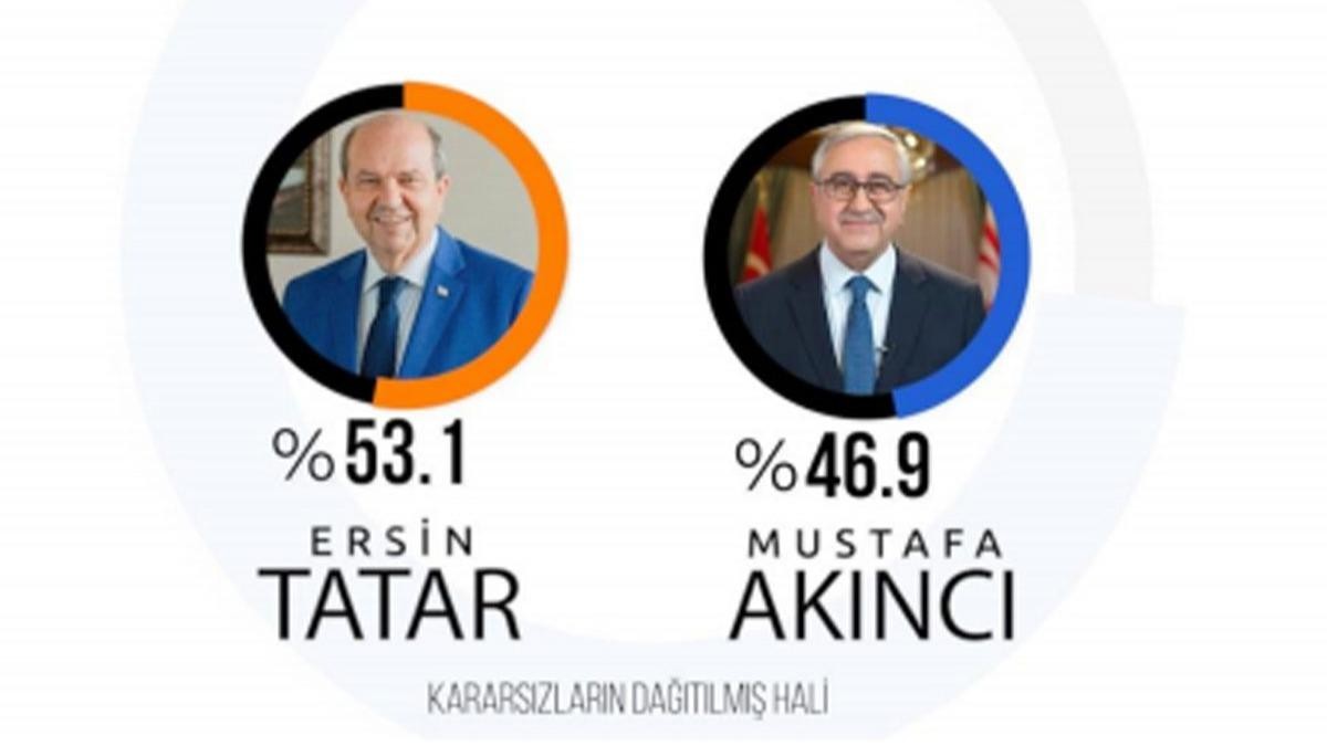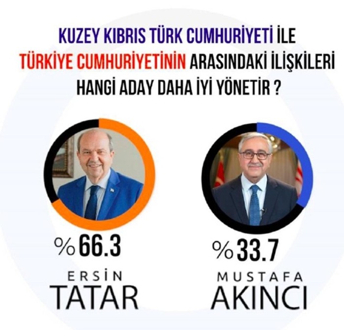 Kuzey Kıbrıs Türk Cumhuriyeti'nde (KKTC) yapılan son ankete göre, 18 Ekim pazar günü yapılacak Cumhurbaşkanlığı seçimini Başbakan Ersin Tatar, yüzde 54 oy oranı ile kazanacağı ifade edildi. Seçim ile ilgili gerçekleştirilen ankete göre halkın yüzde 54,1'i Başbakan Ersin Tatar'a, yüzde 45,9’ü de Cumhurbaşkanı Mustafa Akıncı’ya oy vermek istediğini ifade etti.