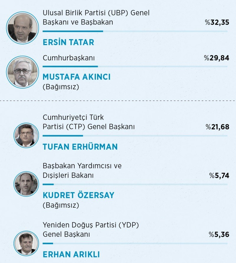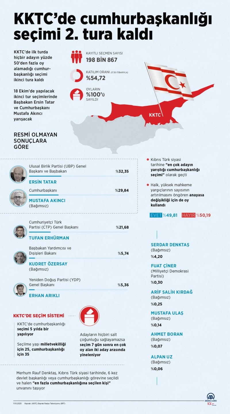 KKTC'de 18 Ekim'de düzenlenecek Cumhurbaşkanlığı seçiminin ikinci turunda mevcut Başbakan Tatar ile mevcut Cumhurbaşkanı Mustafa Akıncı yarışacak.
