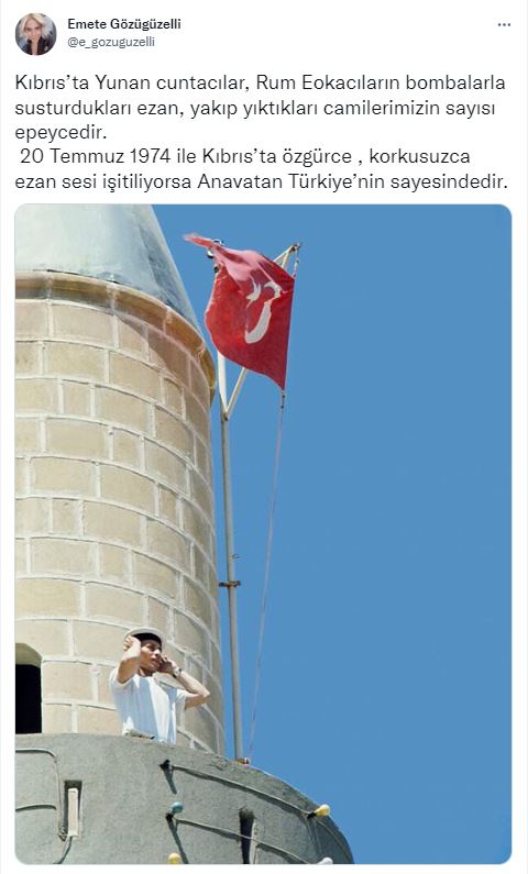 Gözügüzelli paylaşımında, “Kıbrıs’ta Yunan cuntacılar, Rum Eokacıların bombalarla susturdukları ezan, yakıp yıktıkları camilerimizin sayısı epeycedir. 20 Temmuz 1974 ile Kıbrıs’ta özgürce , korkusuzca ezan sesi işitiliyorsa Anavatan Türkiye’nin sayesindedir” ifadelerini kullandı.