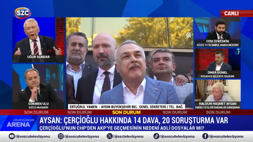 Uğur Dündar’ın Sözcü TV’de sunduğu Arena isimli programda, AK Parti’ye geçen Özlem Çerçioğlu ve yönettiği Aydın Büyükşehir Belediyesi hakkında türlü suçlamalar yapıldı. Belediye hakkında çok sayıda dava açıldığı ileri sürüldü, aynı zamanda kanunen belediyenin yükümlülüğü altında olan icraatları yapması nedeniyle Çerçioğlu’nun suç işlediği algısı oluşturulmaya çalışıldı.