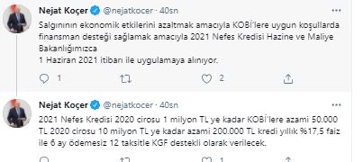 AK Parti Ekonomi İşleri Başkan Yardımcısı, Gaziantep Milletvekili ve Plan Bütçe Komisyonu Sözcüsü Nejat Koçer, sosyal medya hesabından yaptığı paylaşımda, “Salgınının ekonomik etkilerini azaltmak amacıyla KOBİ’lere uygun koşullarda finansman desteği sağlamak amacıyla 2021 Nefes Kredisi Hazine ve Maliye Bakanlığımızca 1 Haziran 2021 itibarı ile uygulamaya alınıyor. 2021 Nefes Kredisi 2020 cirosu 1 milyon TL ye kadar KOBİ’lere azami 50.000 TL 2020 cirosu 10 milyon TL ye kadar azami 200.000 TL kredi yıllık %17,5 faiz ile 6 ay ödemesiz 12 taksitle KGF destekli olarak verilecek” denildi.