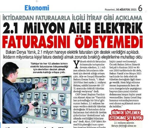 Sözcü gazetesi, devletin, dar gelirli 2,1 milyon aileye sağladığı "Elektrik Tüketim Desteği"ni, "Vatandaşlar faturalarını ödeyemiyorlar" diye haberleştirdi.