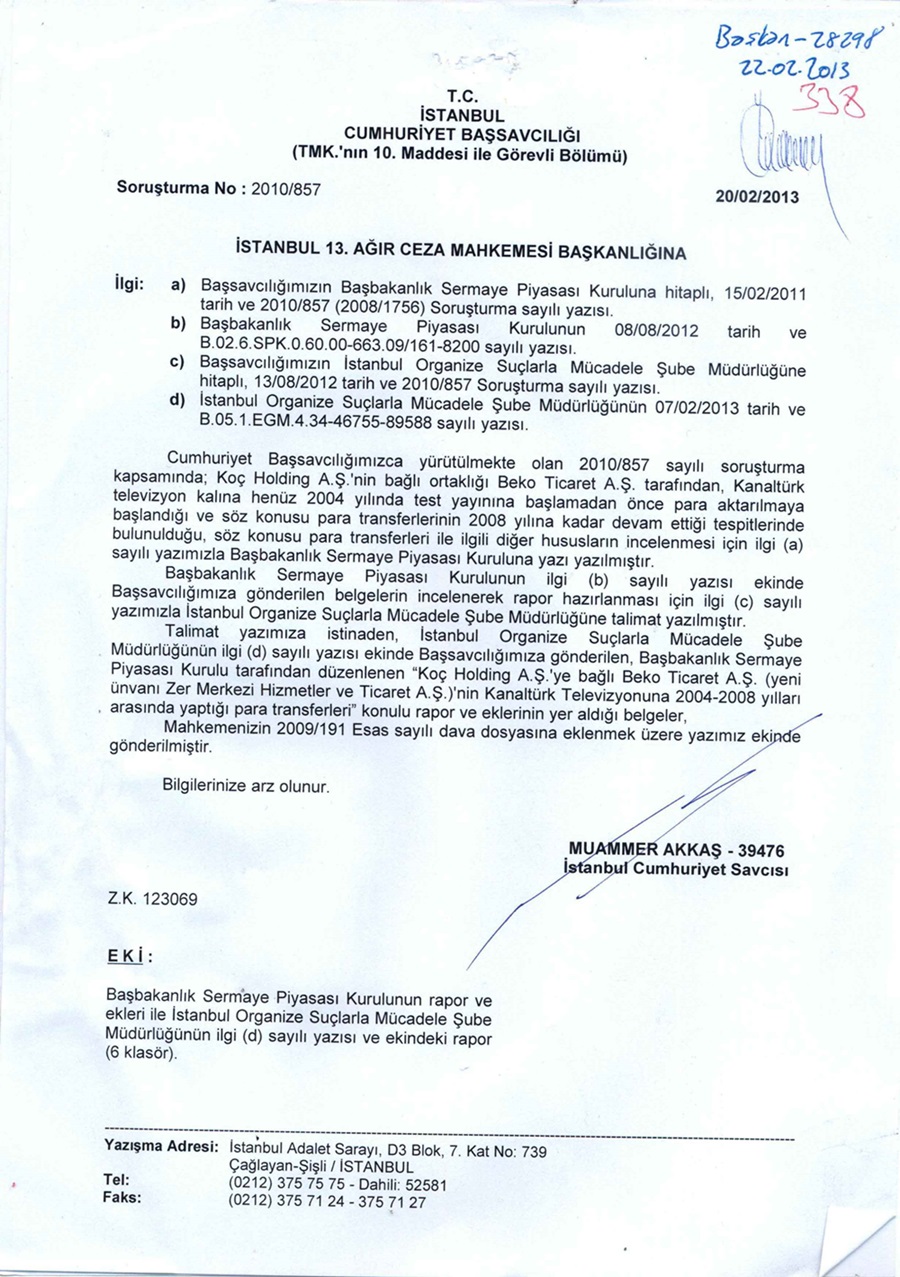 Talimat yazımıza istinaden, İstanbul Organize Suçlarla Mücadele Şube Müdürlüğünün ilgi (d) sayılı yazısı ekinde Başsavcılığımıza gönderilen, Başbakanlık Sermaye Piyasası Kurulu tarafından düzenlenen “Koç Holding A.Ş.’ye bağlı Beko Ticaret A.Ş. (yeni unvanı Zer Merkezi Hizmetler ve Ticaret A.Ş.)’nin Kanaltürk Televizyonuna 2004-2008 yılları arasında yaptığı para transferleri” konulu rapor ve eklerinin yer aldığı belgeler,