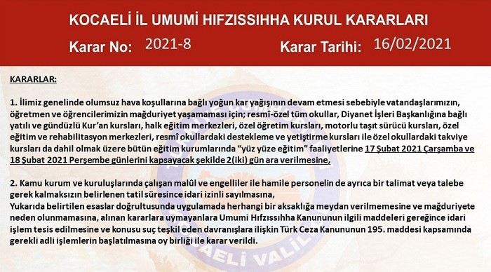 Kocaeli Valiliğinden yapılan açıklamaya göre 17 ve 18 Şubat tarihlerinde eğitime iki günlüğüne ara verildi.