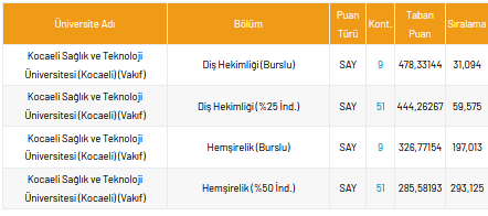 Kocaeli Sağlık ve Teknoloji Üniversitesi 2021 taban puanları ve yüzdelik dilimleri nelerdir?
