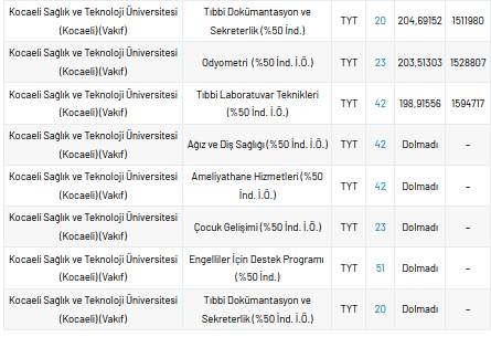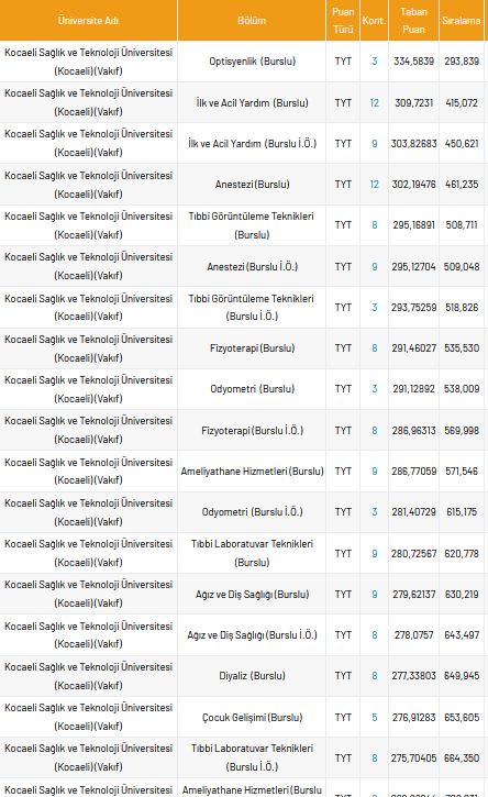 Kocaeli Sağlık ve Teknoloji Üniversitesi 2 yıllık taban puanları 2021, yüzdelik dilimleri ve kontenjan sayıları kaçtır?