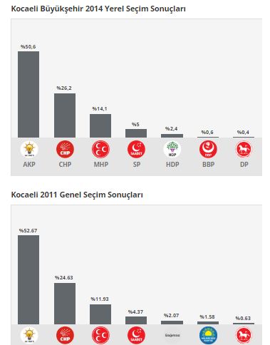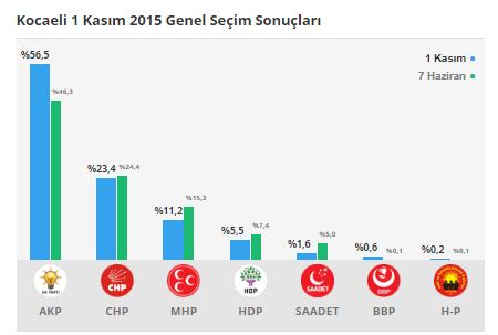 Peki Kocaeli ve ilçelerinde hangi parti ne kadar oy alır? Sorusuna aslında 1 Kasım ve 7 Haziran seçimleri kılavuzluk etmekte. Kocaeli son olarak, 1 Kasım 2015 genel seçimlerinde 3 bin 627 sandık kurulmuş bu sandık sonuçlarına göre, AK Parti % 56,5, Cumhuriyet Halk Partisi (CHP) % 23,4, Milliyetçi Hareket Partisi (MHP) % 11,2, HDP % 5,5 oy alırken, Kocaeli 1 Kasım seçimlerinde AK Parti 7, CHP 3,ve MHP 1 milletvekili çıkardı. Yine 1 Kasım seçimlerinde Hakkari seçimlere katılım oranı % 89,84 olmuştu.
