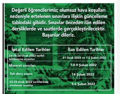 İstanbul'da hangi üniversitelerde kar tatili olduğu son gelişmeler ile devam ediyor. Bazı okullarda dönem sonu sınavları devam ederken olumsuz hava koşulları nedeniyle eğitime ara verildi. Olumsuz hava şartları nedeniyle sınav takvimini güncelleyen üniversiteler arasında Kocael Üniversitesi de var. Kocaeli Üniversitesi Twitter hesabından yapılan açıklamada bazı sınavların ertelendiği bildirildi. Üniversite ileri bir tatile alınan sınavları yeni takvimde paylaştı.
