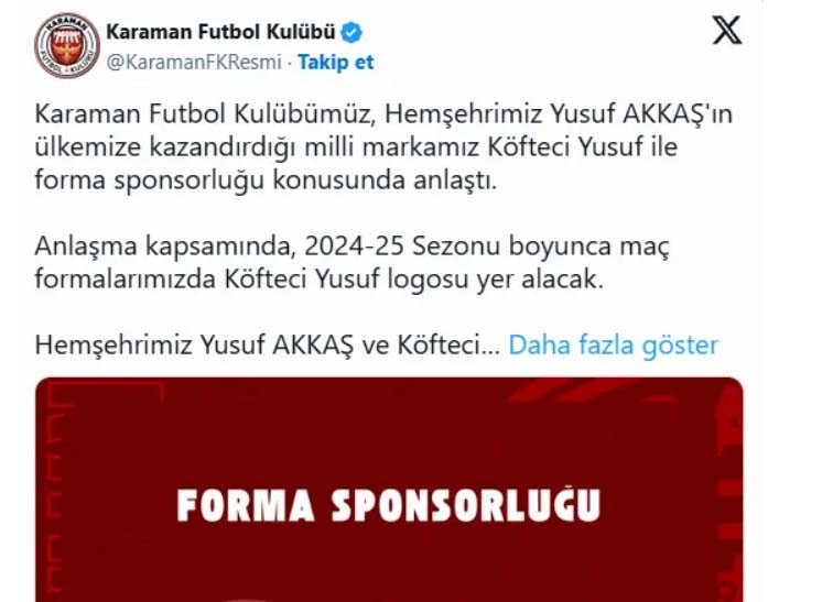 - Karaman Futbol Kulübümüz, hemşehrimiz Yusuf Akkaş'ın ülkemize kazandırdığı milli markamız Köfteci Yusuf ile forma sponsorluğu konusunda anlaştı. Anlaşma kapsamında, 2024-25 Sezonu boyunca maç formalarımızda Köfteci Yusuf logosu yer alacak. Hemşehrimiz Yusuf Akkaş ve Köfteci Yusuf Ailesine, takımımıza verdikleri desteklerden dolayı teşekkür ederiz. Köfteci Yusuf sponsorluğu konusunda Karaman Futbol Kulübümüze destek veren 22., 23. ve 24. Dönem Karaman Milletvekilimiz Sayın Mevlüt Akgün'e değerli katkılarından dolayı teşekkür ederiz.