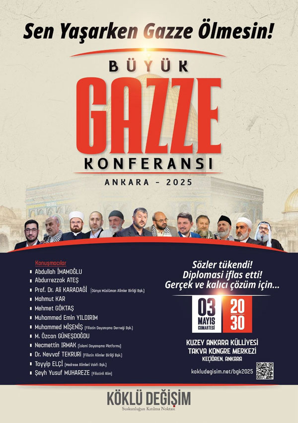 Siyonist vahşeti her alanda dile getiren Köklü Değişim, 03 Mayıs Cumartesi anlamlı bir etkinliğe ev sahipliği yapacak. Köklü Değişim, Gazze Şeridi’nde 50 binden fazla masum sivil şehit edilirken devam eden işgalin gölgesinde, Filistin için gerçek ve kalıcı bir çözümün konuşulacağı "Büyük Gazze Konferansı" düzenliyor.