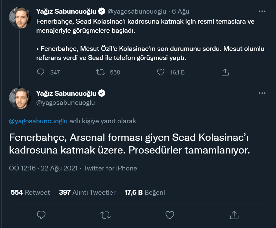 Gelişmeyi Twitter hesabından duyuran gazeteci Yağız Sabuncuoğlu, “Fenerbahçe, Arsenal forması giyen Sead Kolasinac’ı kadrosuna katmak üzere. Prosedürler tamamlanıyor.” ifadelerini kullandı.