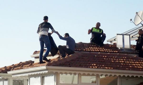 Çatıdaki M.B., polis memuru ve komşuları tarafından yaklaşık 1 saat boyunca ikna edilmeye çalışıldı. "Polis merkezine ve hastaneye gitmek istemiyorum. Artık polis ve doktor görmek istemiyorum. Adamlara da yazık. Hep benimle uğraşmak zorundalar mı, başka işleri yok mu?" diyen M.B., bugüne kadar hep ailesi ne derse onu yapmaya çalıştığını iddia etti. Zaman zaman ayaklarını çatıdan sarkıtan M.B. komşusunun verdiği sigarayı aldı. Bu sırada birçok defa ısrarla 'elini ver' diyen komşusunun uzattığı eli tutan M.B. çatıdan indirildi. M.B., kendisini kurtaran komşusu ve babasıyla birlikte ifade vermek için polis merkezine götürüldü.