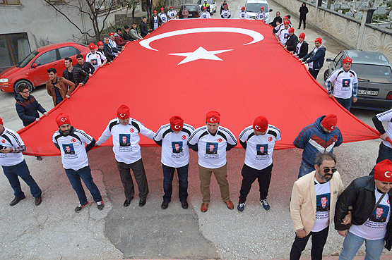 İbrahim Abanoz'un resminin bulunduğu tişörtleri giyen şehidin silah arkadaşları, Karasu Jandarma Komutanlığını önünde Türk bayrağı açıp, marş eşliğinde mezarlığa yürüdü.