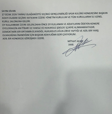“17 Ocak 2026 tarihli olağanüstü seçimli Gençlerbirliği Spor Kulübü kongresine başkan adayı olarak seçime katılmak üzere yönetim kurulum ve tüm kurullarım ile genel kurul salonuna geldik. Oy kullanmak üzere gelen, daha önce oy kullanan ve aidatlarını ödeyen kongre üyelerimizin an itibarıyla haksız ve hukuksuz şekilde içeriye alınmadığını görmekteyiz. Demokratik bir ortamın olmadığı, hukuksuzluğun zirve yaptığı ve adil bir yarışın olmadığına inandığım için başkan adaylığımı geri çekiyorum. Adil bir kongrede görüşmek üzere.”