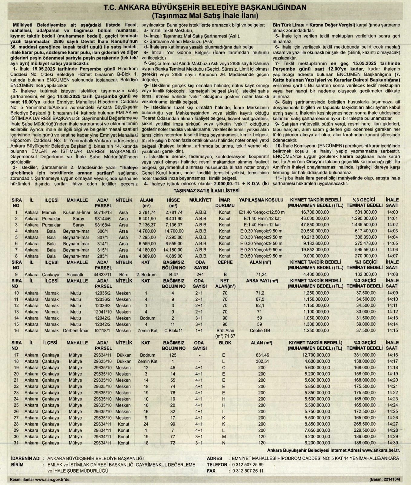 Ankara’nın kaynaklarını konserlere akıtarak büyük tepki çeken CHP’li Ankara Büyükşehir Belediye (ABB) Başkanı Mansur Yavaş, şimdi de gözünü Ankara’nın taşınmazlarına dikti. Çalgı çengiye milyonlar harcanan CHP’li Yavaş, Ankara’nın muhtelif yerlerinden belediyeye ait muhammen bedeli 1 milyon 100 bin Lira ile 47 milyon 850 bin Lira arasında değişen 31 parça arsa, konut ve meskeni satışa çıkardı.