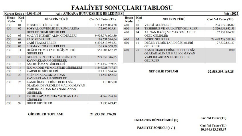 ABB’den Sayıştay’a gönderilen Mali Tablo’da ABB’nin net gelir toplamı 32 milyar 588 milyon 395 bin 165 lira 25 kuruş olurken, giderler toplamı ise 21 milyar 893 milyon 581 bin 776 lira 28 kuruş olarak bildirildi. ABB’nin mali tablosunda, belediyenin 10 milyar 694 milyon 813 bin 388 lira 97 kuruş artıda olduğu ortaya konulurken, ödeme gücü olduğu halde SGK’ya borç taktığı da belgeleriyle itiraf edilmiş oldu.