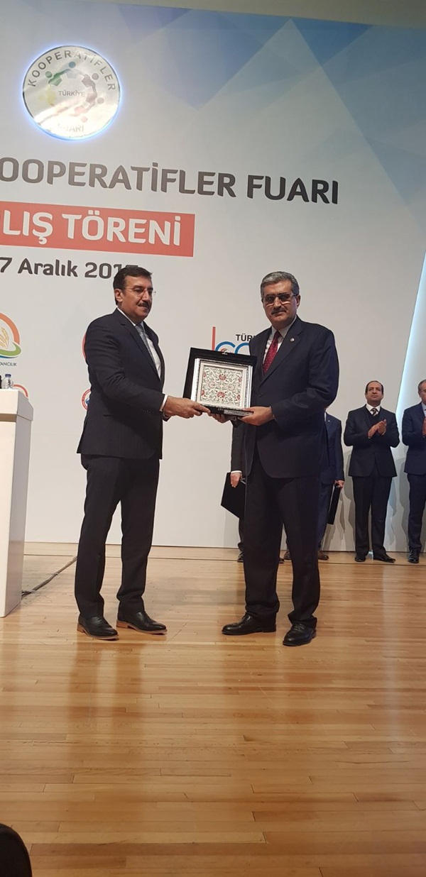 Protokol konuşmalarının ardından başarılı çalışmalara imza atan kooperatiflere ödülleri verildi. PANKOBİRLİK Genel Başkanı Recep Konuk’a “Üstün Hizmet” ödülünü Gümrük ve Ticaret Bakanı Bülent Tüfenkçi verdi. Ödülü, bütün üreticiler adına aldığını belirten Başkan Recep Konuk, konuşmasına ABD’nin Kudüs ile ilgili aldığı kararın bölgede sönmekte olan yangına benzin dökmekten farksız olduğunu belirterek başladı. Türkiye’nin bölgedeki çıkarları ile dünyadaki bazı ülkelerin çıkarları arasında zaman zaman uyumsuzluklar olduğunu ve şimdi de içinden geçtiğimiz bu gibi dönemlerde Türkiye’nin hem siyasi olarak hem de ekonomik olarak sıkıştırılmaya çalışıldığını vurgulayan Konuk, “ülkemiz Allah’a şükür bugün siyasi olarak tarihte olmadığı kadar güçlü. Ekonomimiz de sağlam. Ancak içinden geçtiğimiz dönem bize bir kez daha göstermiştir ki bu tür dönemlerde ülkemize yönelik ekonomik suikastları hasarsız atlatmak için ekonomimizi daha da güçlendirmeli, potansiyelimizi harekete geçirmeli atıl bir ekonomik kaynak bırakmamalıyız. Yani reel sektörü hem güçlendirmeli, hem ülke sathına yaymalı hem de daha çok insanımızın daha çok iş yapmasını sağlayabilmeliyiz. Daha çok insanın girişimci olarak ekonomiye dahil olmasının en kestirme yollarından biri de kooperatifçiliğin geliştirilmesidir. Kooperatifçilik açısından hem avantajlarımız hem de aşmamız gereken zorluklarımız var. Türkiye’deki kooperatifler sadece kendi faaliyet alanındaki zorluklarla mücadele etmiyor. Ülkemiz ekonomisinde gittikçe ağırlığı artan kooperatiflerimiz, bir zihniyet dönüşümünü de gerçekleştiriyorlar. Milletimizin sosyolojisi, kültürü kooperatif mantığına ters mi? Önce bu soruyu cevaplamamız lazım. Sosyal hayatında imece yani ortak işini ortak görme alışkanlığı, iş kültüründe lonca anlayışı olan bir millet için kooperatifçiliğe uzak durmayı sosyoloji ve kültür ile izah etmemiz mümkün değil. Peki, sebep ne olabilir? Mutlaka pek çok sebebi var ama ben özellikle ikisini söylemek istiyorum. Birinci ve önemli neden, kooperatiflerle ilgili algımızdan kaynaklanıyor. Dünyanın en liberal ülkeleri, kooperatif işletmelerini sistemin önemli bir parçası olarak tarif ederken, maalesef bizim ülkemizde kooperatifçilik onlarca yıl bir ideolojinin tabii uzantısı gibi takdim edilmiş ve algılanmıştır. Kooperatif çatısı altında güç birliği yapılamamasının önündeki en büyük psikolojik duvar bu ideolojik algıdandır” diye konuştu.