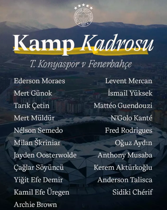 Fenerbahçe'nin, Konyaspor maçı kamp kadrosu şu şekilde: