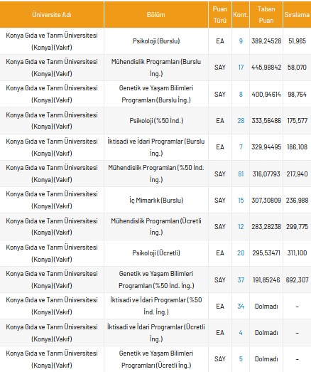Konya Gıda ve Tarım Üniversitesi taban puanları 2021 yüzdelik dilimleri ve kontenjan sayıları kaçtır?