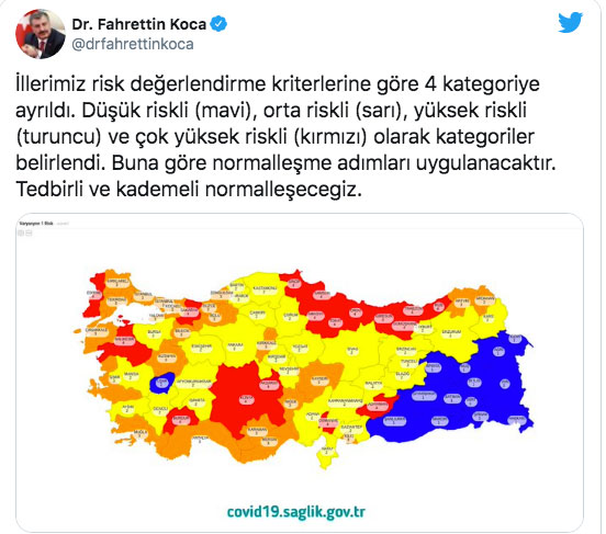 Sağlık Bakanı Fahrettin Koca, son 1 haftada 100 bin nüfusta koronavirüs (Kovid-19) vaka görünme oranı en çok artan ve en çok azalan illeri açıkladı. Bakan Koca, Twitter hesabından yaptığı grafikli paylaşımda, "Son hafta 100 bin nüfusta vaka görünme oranı en çok artan illerimiz: Samsun, Kilis, Balıkesir, İstanbul ve Yalova. En çok azalan illerimiz: Sakarya, Ordu, Amasya, Rize ve Burdur. Birlikte tedbirlere uyarak kontrollü normalleşmeye destek olalım." açıklamasında bulundu.