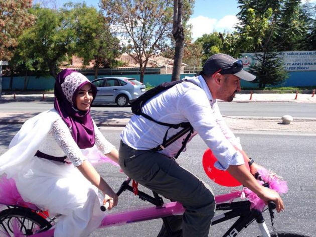 Konya'da hayatlarını birleştiren Hayatı Paylaşanlar Derneği Başkanı Şahin Akkaş ile Cennet Eskin, nikah törenine gelin arabası yerine 'gelin bisikleti' ile gittiler.Hayatı Paylaşanlar Derneği Başkanı Şahin Akkaş ile Cennet Eskin, kıyılan nikahla hayatlarını birleştirdi. Çift, nikah salonuna özel olarak hazırlanan çift kişilik bisikletle gitti. Çifte, arkadaşları da bisikletlerle konvoy oluşturarak eşlik etti.