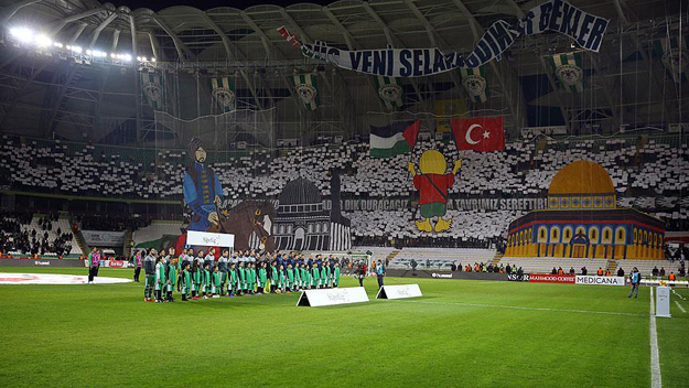 Süper Lig'in 17. haftasında Atiker Konyaspor-Fenerbahçe karşılaşması öncesinde ev sahibi takım taraftarları, Kudüs için 3 boyutlu koreografi gerçekleşti.