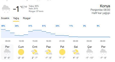 Meteoroloji Genel Müdürlüğü tarafından yapılan son değerlendirmelere göre: Ülkemiz genelinin parçalı ve çok bulutlu, Marmara’nın doğusu, Akdeniz, İç Anadolu, Karadeniz, Doğu ve Güneydoğu Anadolu, Denizli, Kütahya ve Afyonkarahisar çevreleri ile Çanakkale'nin doğu kesimlerinin yağışlı geçeceği tahmin ediliyor. İç Anadolu Bölgesi Çok bulutlu, bölge genelinin karla karışık yağmur ve kar yağışlı geçeceği tahmin ediliyor. Sabah ve gece saatlerinde bölge genelinde buzlanma ve don olayı ile birlikte yer yer sis ve pus bekleniyor. Konya hava durumu: Çok bulutlu, sabah ve öğle saatlerinde kar yağışlı.