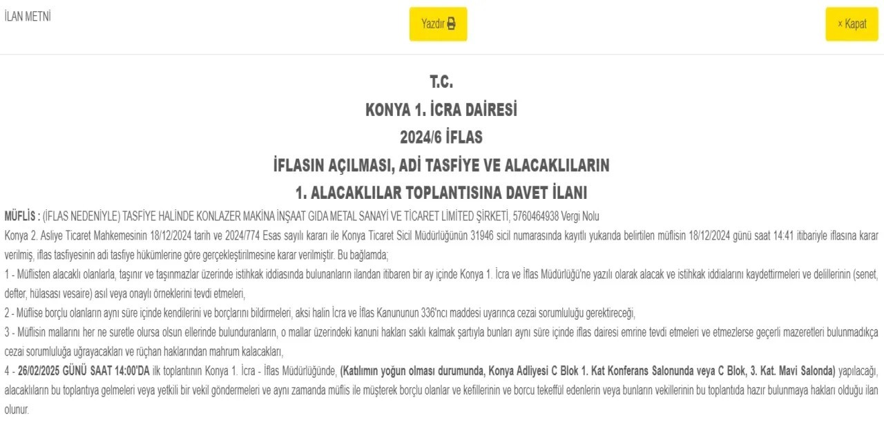 Son olarak Konya 1. İcra Dairesi Müdürlüğü alacaklılara çağrıda bulundu. Bu kapsamda alacağı olanların alacaklarını bildirmesi gerektiği uyarısında bulunuldu.