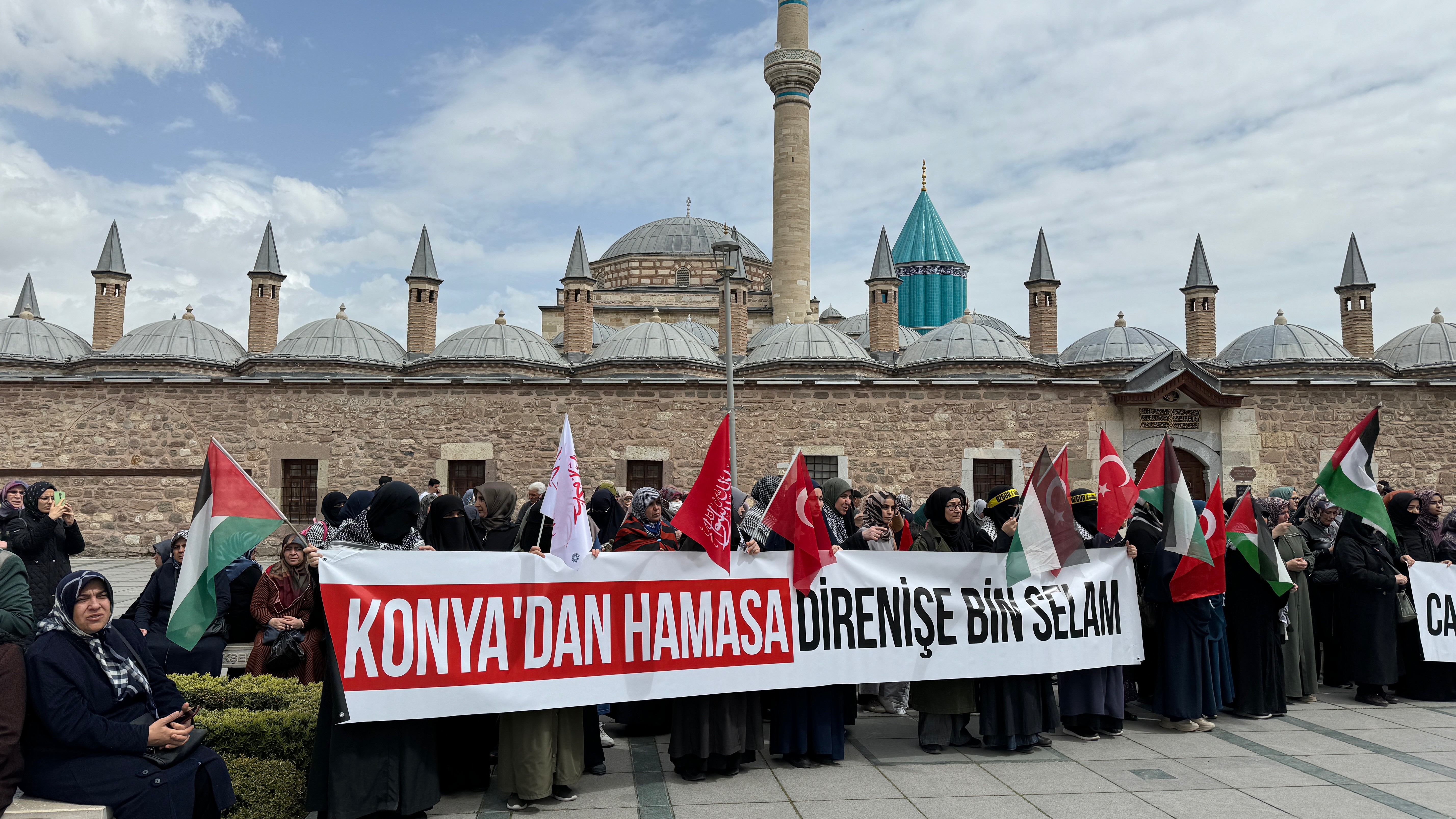 Mevlana Meydanı'nda toplanan Konya Sivil Toplum Kuruluşları (STK) temsilcileri, ellerinde bayrak ve dövizler taşıdı.
