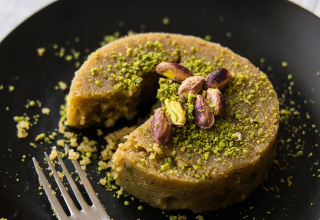 Derin bir tencerenin içerisine kaymağı koyun. Kaymağın içerisine tereyağı ve fıstığı ilave ederek kaynatın. Kaynayan karışım üzerine un ilave ederek koyu bir ren elde edinceye kadar kavurun. Ayrı bir tencerede sütü kaynatın. Kaynayan sütü höşmerime ekleyin ve son olarak bir su bardağı şeker eklediğiniz höşmerimi fıstıkla süsleyerek servis edebilirsiniz.