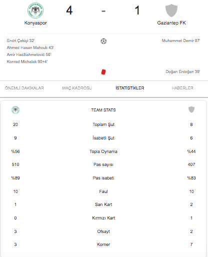 90+4 dakikada ev sahibi ekip farkı tekrar 3'e çıkardı. Mpoku'nun pasında ceza sahası içinde topla buluşan Hadziahmetovic, meşin yuvarlağı Michalak'a bıraktı. Bu oyuncunun sert şutunda meşin yuvarlak ağlarla buluştu: 4-1 Karşılaşma Konyaspor'un 4-1 üstünlüğüyle tamamlandı.