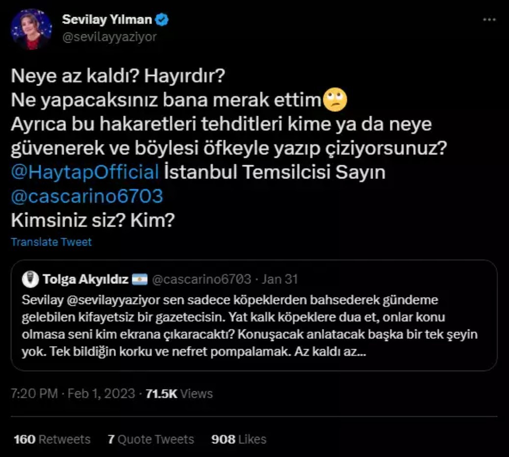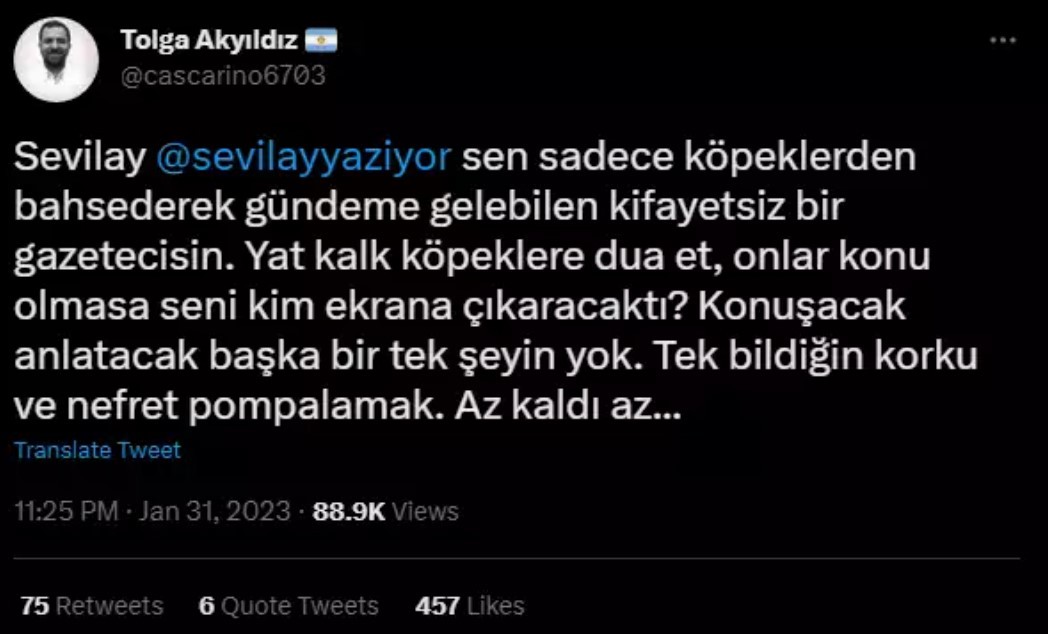 Tartışmaya HAYTAP - Hayvan Hakları Federasyonu İstanbul Temsilcisi Tolga Akyıldız da dahil oldu. Twitter hesabı üzerinden Sevilay Yılman'a seslenen Akyıldız, "Sevilay sen sadece köpeklerden bahsederek gündeme gelebilen kifayetsiz bir gazetecisin. Yat kalk köpeklere dua et, onlar konu olmasa seni kim ekrana çıkaracaktı? Konuşacak anlatacak başka bir tek şeyin yok. Tek bildiğin korku ve nefret pompalamak. Az kaldı az..." ifadelerini kullandı.