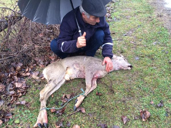 Yaşadığı korku nedeniyle ayakları bağlanarak, sakinleştirilmeye çalışan karaca, yağan yağmurdan da şemsiye ile korundu. Haber verilmesi üzerine köye gelen Doğa Koruma ve Milli Parklar Şubesi ekipleri, karacayı teslim alarak kent merkezindeki veteriner kliniğine götürdü. 9 aylık karacanın boynuzlarında yara, karın altında da kesikler olduğu tespit edildi. Veteriner hekim Tolga Kandıralı tarafından tedavi edilen karaca doğal ortamına bırakıldı.