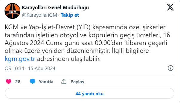 İstanbul-Ankara Anadolu Otoyolu otomobiller için 187 TL oldu. İstanbul-İzmir Otobanı ücreti Osmangazi Köprüsü geçiş ücreti dahil otomobiller için 1370 TL oldu.