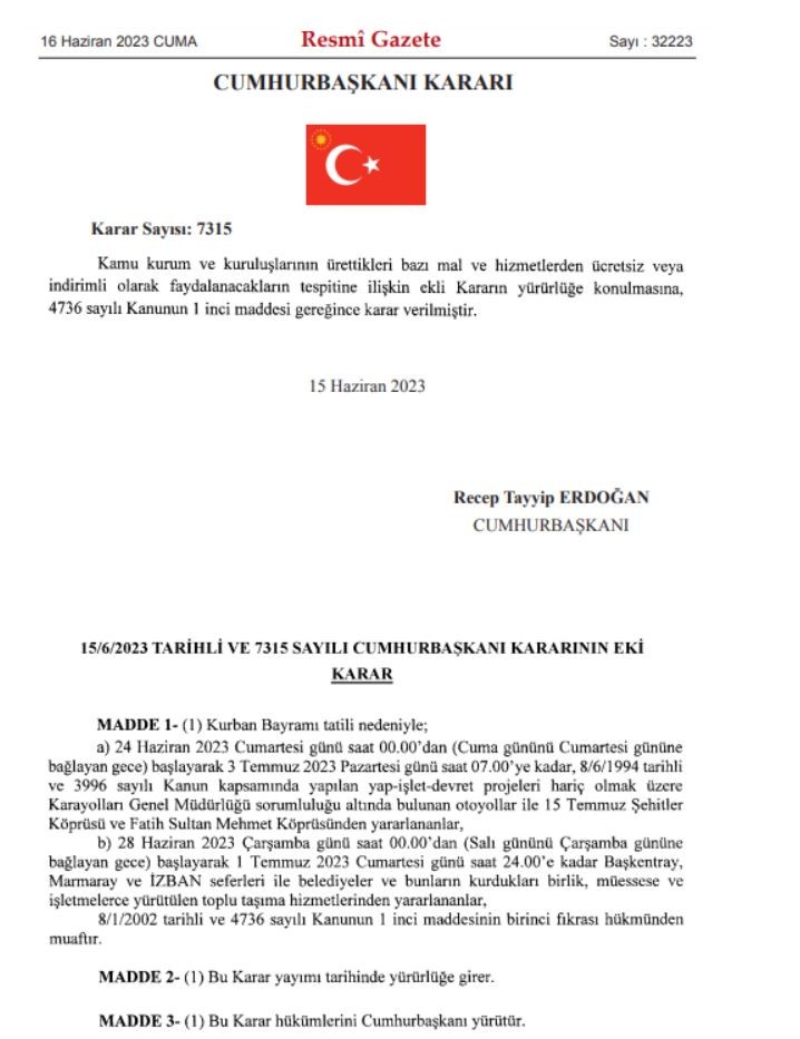Cumhurbaşkanı Recep Tayyip Erdoğan imzalı yayımlanan kararda 9 günlük Kurban Bayramı tatili boyunca yap-işlet-devret projeleri hariç olmak üzere Karayolları Genel Müdürlüğü sorumluluğunda bulunan otoyollar ile 15 Temmuz Şehitler Köprüsü ile Fatih Sultan Mehmet Köprüsü ücretsiz olacak.