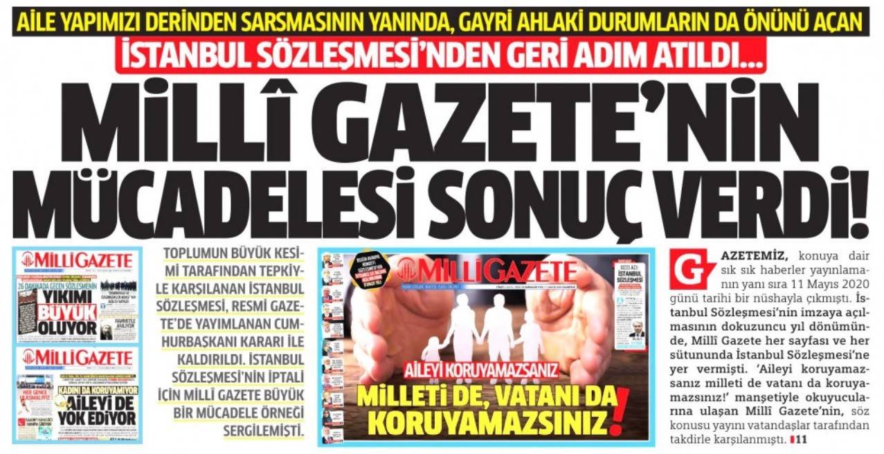 Feminaziler tarafından desteklenen ve Müslüman Türk toplumunun temeline dinamit koyan "İstanbul Sözleşmesi" adlı ifsat projesi 20 Mart 2021 tarihinde Resmi Gazete'de yayımlanan Cumhurbaşkanı Kararı ile feshedildi. Erdoğan'ın imzaladığı kararname ile İstanbul Sözleşmesi'nin yürürlükten kaldırılması aile düşmanı feminist çevreler ve solak güruhu rahatsız ederken, sözleşmenin kaldırılması sonrası Milli Gazete "Mücadelemiz sonuç verdi" başlığını attı.